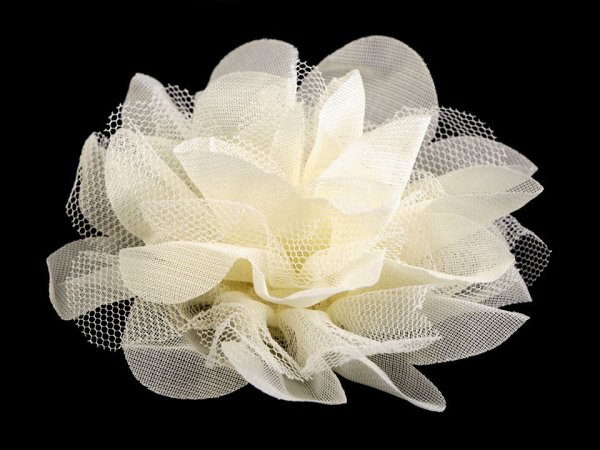 Romantický textilní květ má široké možnosti využití. Díky bohatým okvětním plátkům má nadýchaný vzhled. Ve spodní části má textilní kolečko, díky kterému jej pohodlně kamkoliv upevníte. Použití: Květ můžete našít jako ozdobu na společenské šaty, halenky, trička nebo svetry. Je vhodný i na zdobení klobouků, čepic a čelenek do vlasů. Můžete ho také pomocí lepidla přilepit na brožový můstek a vytvořit zajímavý šperk.