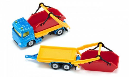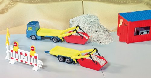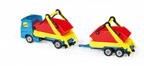 Ať už písek, kámen nebo suť – nákladní automobil s korbou a přívěsem toho uveze hodně! Tahač je dvounápravový nákladní automobil s kovovou kabinou řidiče a přívěs má podvozek s tandemovou nápravou a kovovou plošinou. Na nákladním voze a přívěsu lze přepravovat každý jeden kontejner. Spouštěcí zařízení na obou částech vozidla je pohyblivé, takže korby lze snadno nakládat a vykládat. Volně běžící kola v celé kombinaci zajišťují mobilitu a zjednodušují manévrování. Jasně červené korby vytvářejí poutavý kontrast k modrému nákladnímu automobilu se žlutými vykládacími rameny. Tato jasná a všestranná kombinace vozidel umožní zopakovat nespočet scénářů na staveništi! Rozměry balení: 19,7 x 7,8 x 3,2 cm. Věk: 3+