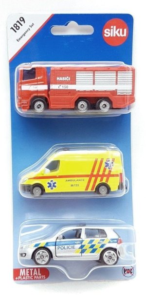 SIKU sada záchranných vozidel v české verzi. Tyto modely SIKU se vyznačují realistickými detaily a jsou vyrobeny z tlakově litých kovových a plastových komponentů. Sada obsahuje tři vozidla: Velký hasičský vůz, Ambulance dodávka a Policie osobní automobil BMW M3 coupé. Baleno v blistru. Rozměry balení: 7,8 x 19,7 x 3,8 cm. Věk: 3+
