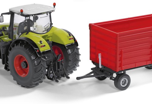 Přívěs za traktor v měřítku 1:32. Dvouosé středové otočné talířové přívěsy jsou nezbytnou součástí pracovního zařízení při farmářských pracích a sklizni. Přívěs je vybaven kovovým podvozkem a sklopným plastovým žlabem. Pravá bočnice lze otevřít. Funkce sklopení je umístěna na pravé straně. Spojka přívěsu umožňuje spojit dva z těchto přívěsů jako sběrný tým. Rozměr balení: 115 x 210 x 82 mm. Rozměr: 185 x 69 x 91 mm. Věk: 3+
