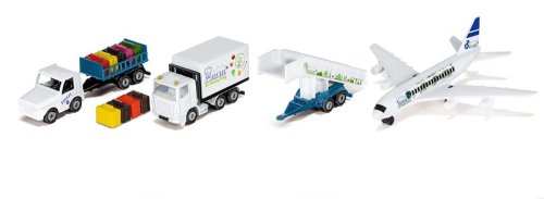 SIKU Super – Letištní odbavovací set. Nová sada SIKU letiště se skládá z čtyřproudého komerčního letadla, zásobovacího cateringového auta, vozidla s vlečkou a kufry cestujících, přívěsem se schody a pětimetrovou samolepící páskou s přistávací dráhou. Výška zavazadlového přívěsu lze nastavit pomocí nůžkového mechanismu. Otevírací klapky usnadní nakládání a vykládání. Vlečka s kufry lze odpojit a vyměnit za přívěs se schody. Lepící páska s přistávací dráhou lze přilepit na hladké podlahové krytiny nebo koberec s krátkým vlasem. Kufry cestujících lze otevřít. Rozměr balení: 355 x 210 x 60 mm. Věk: 3+