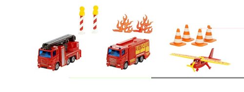 Do řídícího střediska přichází tísňové volání. V nemocnici hoří! Hasiči se připravují na svou misi. Tato nová hasičská jednotka ze Siku spojuje tři unikátní záchranná vozidla. Třínápravové těžké nákladní vozidlo s kovovou kabinou řidiče je vybaveno záchrannou plošinou, která se otáčí o 360 stupňů a má tři kloubové spoje. To znamená, že žebřík s připojeným košem může být vytažen do impozantní výšky a koš může být podle potřeby narovnán. To výrazně zjednodušuje záchranu i z velkých výšek. Obě vozidla mají vysokorychlostní kola, takže mohou jet rychlostí blesku. Pro přepravu a monitorování ze vzduchu je součástí setu letadlo v barvách hasičského sboru. Se sklopným křídlem a rotující vrtulí je toto záchranné letadlo nezbytným partnerem pro obtížná nasazení. Sada obsahuje také sloupky a kužely, aby se uzavřelo místo nehody. Součástí sady jsou i malé plameny. Rozměr balení: 29,6 x 11 x 4,8 cm. Věk: 3+