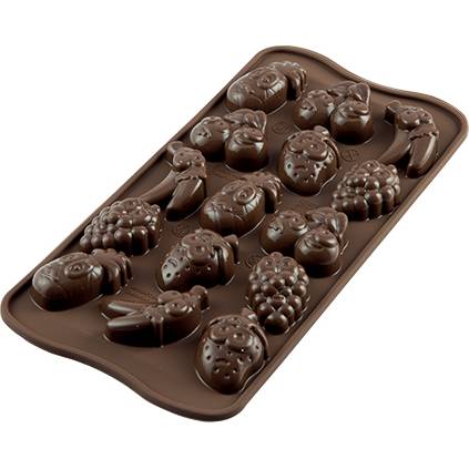 Nepřilnavá forma ze silikonu na přípravu patnácti bonbonů ve tvaru veselého ovoce s očima.