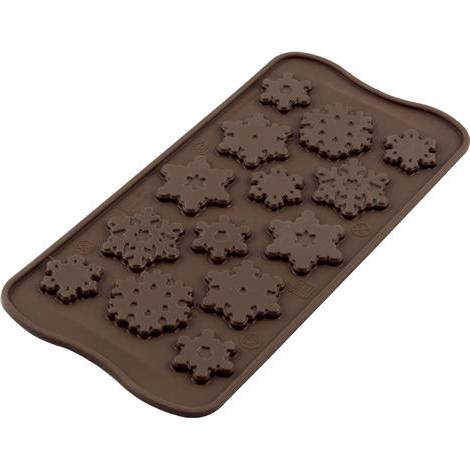 Silikonová forma na přípravu 14ti čokoládek ve tvaru různých druhů sněhových vloček.