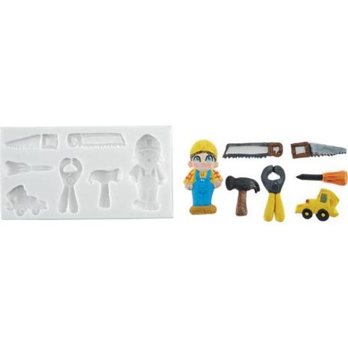 Silikonová forma na tvarování ozdob z cukrářských hmot nebo čokolády ve tvaru stavitele a nářadí.