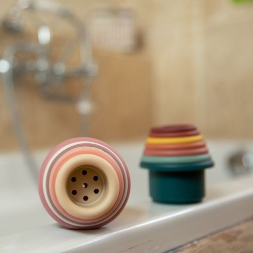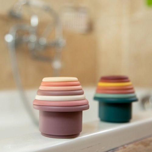 Silikonové stohovací kalíšky různých velikostí a barev.
