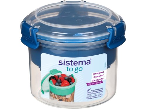 Sistema TO GO 530 ml s vnitřní oddělenou miskou a lžičkou je chytrý a praktický pomocník pro všechny, kteří si chtějí vzít zdravou snídani nebo svačinku do práce, do školy nebo na výlety. Praktický tvar umožňuje ukládat odděleně různé druhy potravin a promíchat je těsně před konzumací. Ve spodní části můžete uložit třeba jogurt, v horní jakoukoliv vhodnou přísadu (müsli, ovoce, sušené plody nebo cereálie). Díky přiložené lžičce můžete svoje oblíbené pochoutky konzumovat kdekoliv. Stohovatelný tvar zajišťuje maximální využití prostoru ve spíži, chladničce a mrazničce.