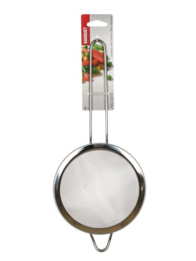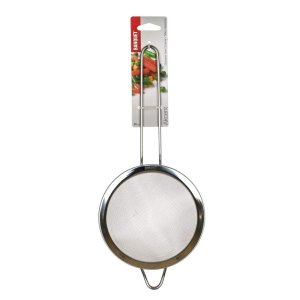 průměr: 10 cm délka držadla: 13 cm držadlo se závěsným očkem materiál: nerez 202 počet oček: 20 na cm2 síla sítě: 0,28 mm materiál držadla: kov
