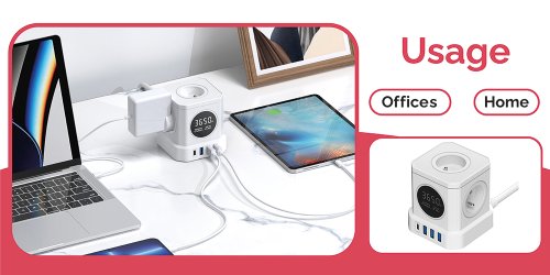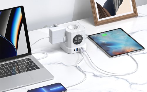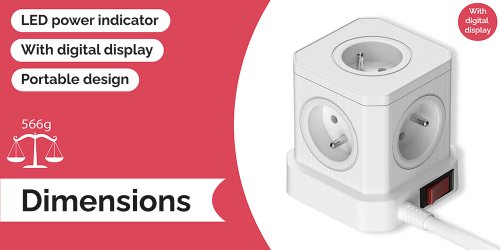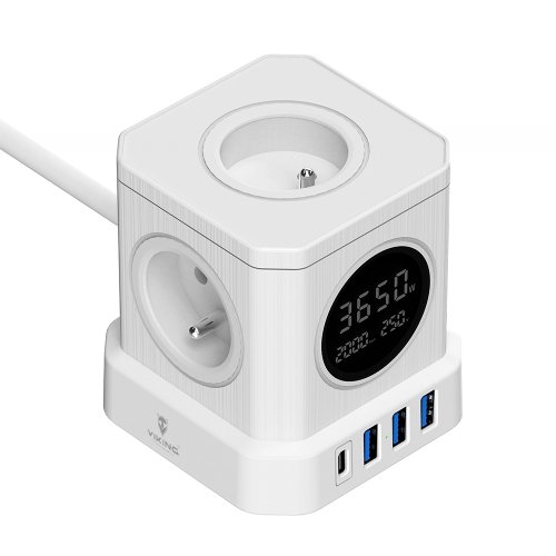 Síťový adaptér • zásuvka • rozbočovač • 4 × AC výstup (220V-250V/16A) • 3 × USB-A výstup 12W (5V/2.4A celkem) • 1 × USB-C výstup 20W (5V/3A,9V/2.22A, 12V/1.67A) • digitální displej zobrazující výkon, spotřebu energie a napětí • tlačítko ON/OFF pro snadné vypnutí • délka kabelu 2m • kompaktní rozměry a moderní design • možnost nabíjení až 8 zařízení současně