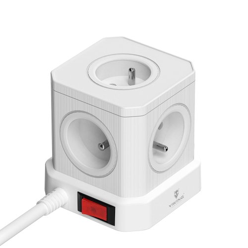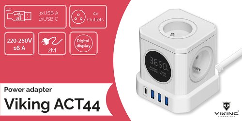 Síťový adaptér Viking ACT44 Síťový adaptér Viking ACT44 kombinuje čtyři USB porty (3× USB-A a 1× USB-C), čtyři AC zásuvky a 2m prodlužovací kabel v jednom kompaktním zařízení. Šetří místo a umožňuje napájet až osm zařízení současně.