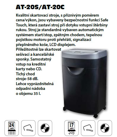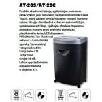 Skartovačka AT-20C s příčným řezem je kombinací spolehlivého výkonu a bezpečnosti pro domácí i kancelářské použití. Zvládne skartaci až 17 listů najednou. Navíc si poradí i se svorkami, kancelářskými sponkami, platebními kartami a CD. Díky technologii Safe Touch se při dotyku vaší ruky okamžitě zastaví, což zajišťuje maximální bezpečnost.