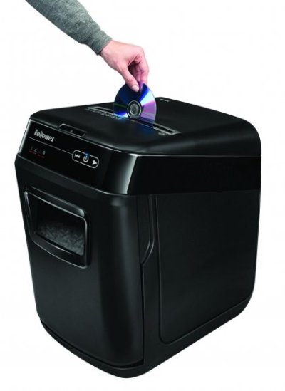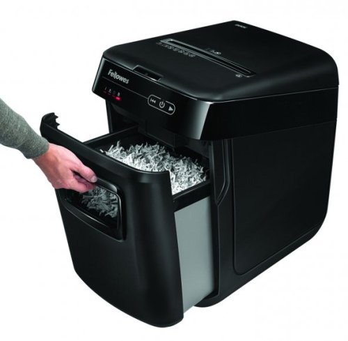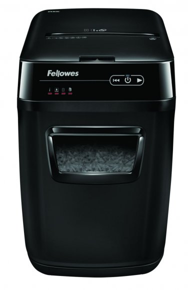 Skartovač AutoMax 200C DIN 3 značky Fellowes s křížovým řezem 4 x 38 mm poskytuje skartovací kapacitu až 200 listů / 70 g papíru, objem koše až 32 litrů a šíři vstupu 345 mm.