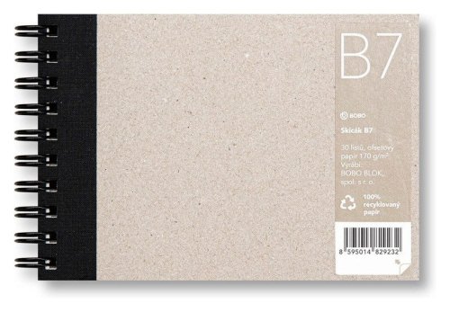 Malý, ale prostorný skicák B7 je perfektním společníkem pro každodenní tvořivost. Recyklovaný papír je dostatečně pevný, aby byly vaše výtvory dokonalé. br brFormát B7 je ideální pro ty, kteří si chtějí tvořit všude, kam jdou. Skicujte své myšlenky na cestách a objevujte nové způsoby, jak vyjádřit svou vizi i na malém prostoru. br brSkicáky s recyklovaným papírem jsou malé umělecké dílny, které představují spojení mezi tvořivostí a udržitelností. Každý list v tomto skicáku je vyroben z recyklovaného papíru, a tak můžete psát, kreslit a tvořit s lehkým srdcem a vědomím, že chráníte naši planetu. br brTento recyklovaný papír je navíc dostatečně pevný a vhodný na suchou i mokrou techniku tvorby. Kreslete tužkou, uhlem, pastely nebo pastelkami. Můžete také použít akrylové, temperové, olejové nebo vodové barvy a inkousty. br brSkicák s recyklovaným papírem, B7 br• Formát: B7 br• Lineatura: Čistá br• Počet listů: 30 br• Papír: Ecoline 170 g, bílý, recyklovaný, certifikace FSC® a Blue Angel br• Vazba: Dvojitá kroužková spirála Twin Wire br• Pevné desky - vyrobeny ze 100% sběrového papíru, certifikace FSC® br• Černé knihařské plátno br brKroužková vazba Twin Wire umožňuje snadné otáčení listů až o 360° bez posunutí stránek. Skicák zůstane otevřený na zvolené stránce.