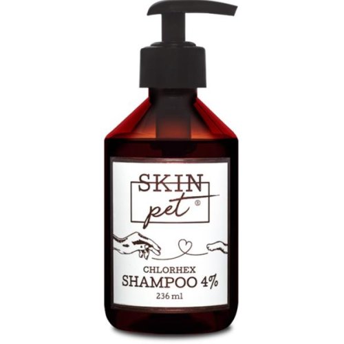 Veterinární přípravek SkinPET® Chlorhex Shampoo 4% je určený především pro krátkodobou akutní péči po operacích, úrazech nebo při infekcích kůže a jiných kožních potížích (dermatitida) psů, koček a koní. Šampon díky šetrnému složení neštípe, nedráždí a nevyvolává alergie. Antiseptické látky snižují mikrobiální zátěž a riziko infekce. Šampon šetrně čistí, eliminuje zápach a navrací srsti i pokožce přirozený lesk. Neobsahuje pěnivé složky, které jsou častou příčinou svědění a podráždění citlivé pokožky zvířat. Neobsahuje ani silné parfemace, na které mohou být zvířata citlivá. Chemické vůně navíc mohou vyvolat podráždění, ekzém či alergickou reakci. Šampon SkinPET® obsahuje pouze přirozenou a jemnou vůni Green Tea. Hlavní přednosti šamponu:
