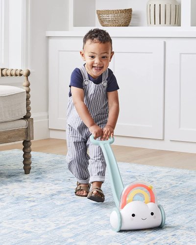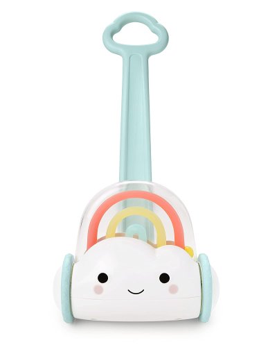 Klasická hračka na tlačení s veselým dizajnem obláčka a duhy s korálky. Poskytne dětem veselou a zábavnou podporu při jejich prvních dobrodružných krůčcích. Duha s barevnými kuličkami odměňuje dítě za každý krok zábavnými praskajícími zvuky. Skvělý způsob, jak si při hře vybudovat jistotu při chůzi, hrubou motoriku, rovnováhu a další dovednosti.