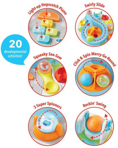 Moderní aktivní stolek s 20 aktivitami, který okouzlí Vaše děťátko již od 6 měsíců a bude s ním růst až do 3 let. Stolek umožňuje 2 stupně zábavy podle věku dítěte - první na zemi a druhý vestoje. Díky velkému počtu aktivně stolek přizpůsobí vývoji děťátka. Určitě bude rádo chytat, házet a kutálet osm roztomilých barevných míčků nebo hrát s klavírikom, zatočený skluzavkou nebo dalšími aktivitami, které podporují zábavu a kreativitu. Moderní, jednoduché provedení a vícenásobné využití stolku způsobí, že se stane oblíbeným společníkem při rodinných zážitcích a hrách na dlouhé období.