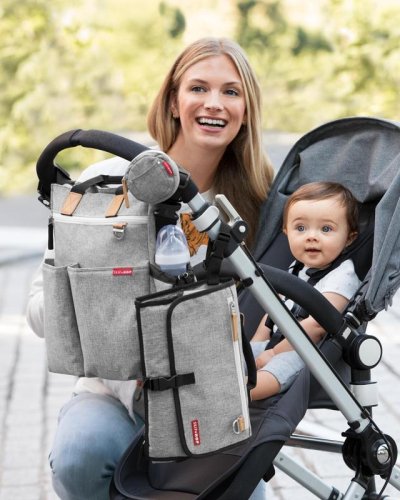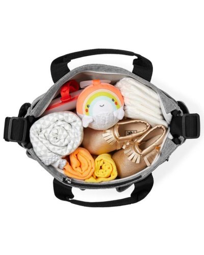Oddělené kapsy umožňují větší přehlednost - celkem 10 praktických kapes. Tašku lze pohodlně zavěsit na kočárek nebo ji nosit volně přes rameno či v ruce. Obsahuje patentované "Shuttle Clips", díky kterým lze ramenní popruh snadno odepnout nebo nechat na tašce - dle vašeho vkusu. Odepněte menší přezku, obtočte pás kolem rukojeti kočárku a zajistěte. Větší sponou lze odepnout ramenní popruh. Protiskluzové popruhy na kočárek. Součástí boční kapsa na láhev a kapsa na mobilní telefon. Kapsy se zapínají na magnety nebo zipy. Uvnitř tašky je kontrastní podšívka, díky které vše lehce najdete. Taška dále obsahuje polstrovanou přebalovací podložku.