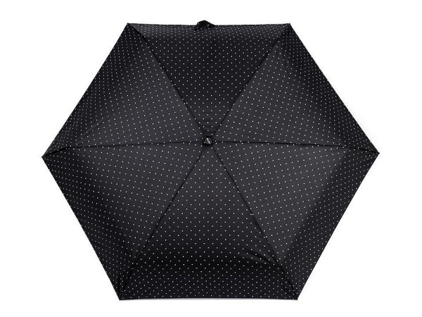 Skládací deštník s puntíky je díky hliníkové konstrukci a malé velikosti lehký a skladný, pohodlně se vám vejde do kabelky. Konstrukce je tvořena šesti poli. Rukojeť deštníku je plastová a opatřená poutkem. Zapínání je klasické na suchý zip. Součástí deštníku je ochranný obal, který se zapíná na zip. Hloubka deštníku je 20 cm. Celková délka je 56 cm. Délka složeného deštníku je 20 cm.