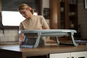 Vanička je vybavena výpustním ventilem a páskovým teploměrem, což výrazně zvyšuje komfort a bezpečnost při každodenním používání. Dá jednoduše složit na výšku pouhých 10 cm, přičemž plastové nožičky se sklopí přímo pod vaničku – díky čemuž zabírá minimum místa a je ideální pro skladování i v menších prostorách.
