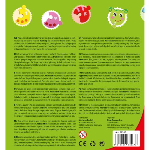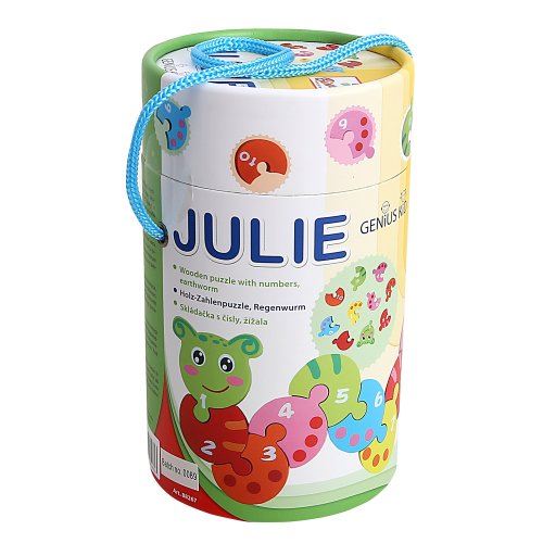 Pomocí jednoduché skládačky ve tvaru žížaly se děti mohou zábavným způsobem naučit chápat posloupnost a základní čísla. Robustní dílky jsou snadno uchopitelné a pestře zbarvené, snadno si tak získají a udrží dětskou pozornost. Vyrobeno z masivního dřeva ošetřeného nezávadnými barvami. Dodáváno v praktické, snadno přenosné tubě opatřené poutkem. Hlavní vlastnosti:10 dílů skládačkyodolné provedení z masivního dřevapraktické balení