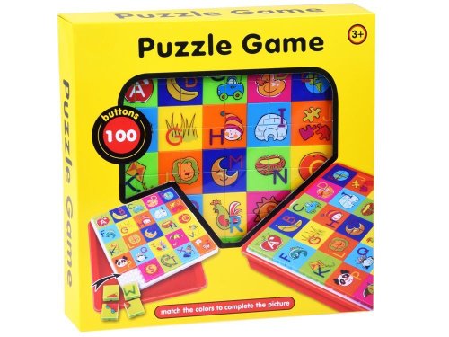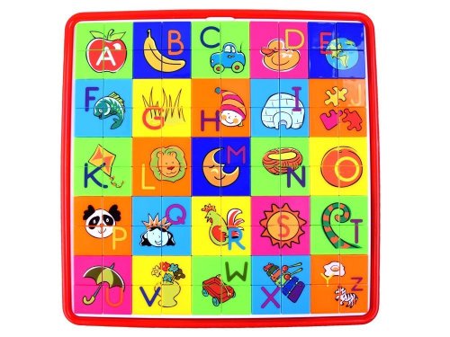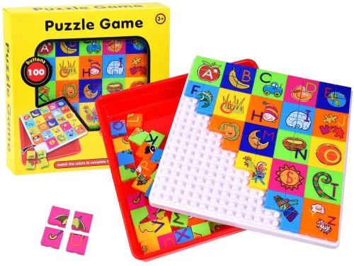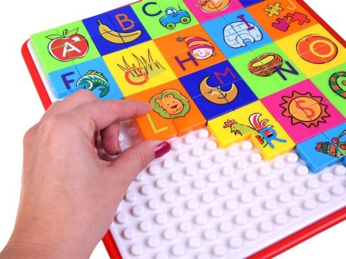 25 čtyřdílných skládaček písmen, 100 barevných čtverečků podkladová deska s výstupky a úložným prostorem pro uchovávání dílků a snadné přenášení každé písmeno je doplněno obrázkem (A - Apple , B - Banana, C - Car atd.) rozvíjí představivost, učí soustředit a buduje trpělivost efektivní učení anglických slovíček pro menší děti lze využít na učení barev