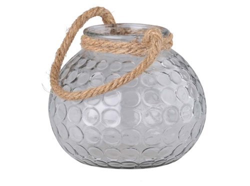 Tato stylová lampa o rozměrech 15 × 12,5 cm upoutá svým jednoduchým, ale výrazným vzhledem. Kombinace čirého skla a lana působí přírodně a vzdušně. Díky své velikosti je vhodná jako solitérní dekorace i součást většího aranžmá. Výborně se hodí na stůl, parapet nebo jako závěsná dekorace v předsíni či na terase.