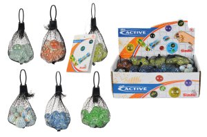 Skleněné kuličky na cvrnkání v síťce. Balení obsahuje 20 kuliček o průměru 16 mm a 1 kuličku o průměru 25 mm. Displej obsahuje 20 ks. 6 barevných provedení.