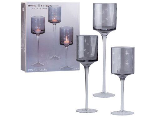 Sada tří skleněných svícnů o rozměrech 90 × 250, 90 × 300 a 90 × 350 mm na nožičkách. Kouřové sklo dodává moderní a sofistikovaný vzhled. Svícny jsou vhodné pro kónické svíčky nebo čajové svíčky a vytvářejí příjemnou a hřejivou atmosféru v interiéru.