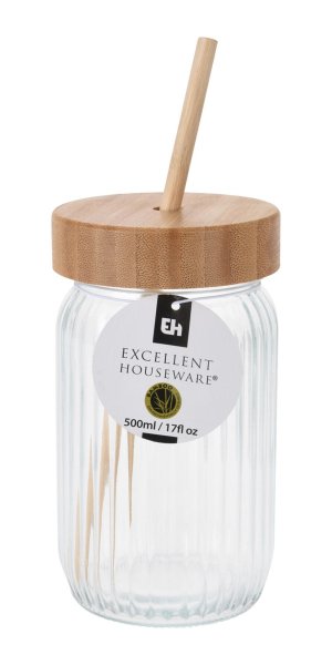 objem: 500 ml průměr: 8 cm výška: 14,5 cm hmotnost: 290 g materiál: sklo, bambusové víčko a brčko