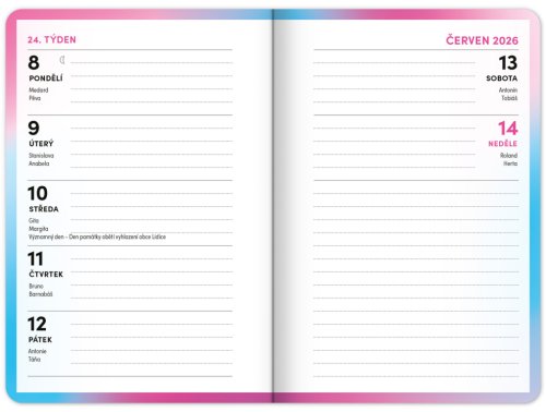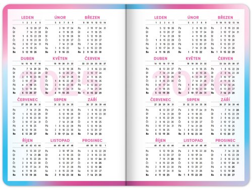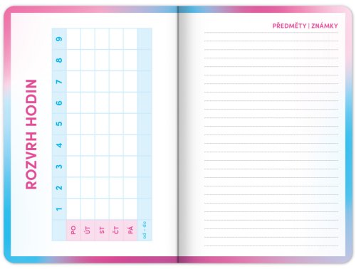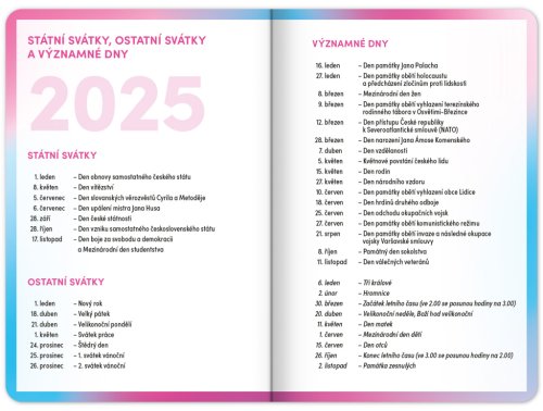 Školní diář obsahuje přehled na rok 2025 a 2026, české týdenní řádkové kalendárium se jmény a svátky, rozvrh hodin, prostor na poznámky a základní poznatky z češtiny, angličtiny, matematiky a fyziky …