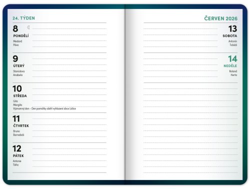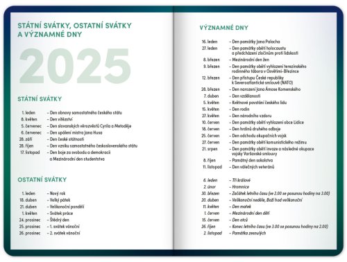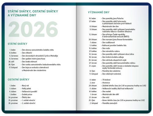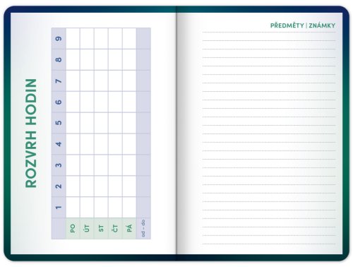 Školní diář obsahuje přehled na rok 2025 a 2026, české týdenní řádkové kalendárium se jmény a svátky, rozvrh hodin, prostor na poznámky a základní poznatky z češtiny, angličtiny, matematiky a fyziky pro školáky a školačky. Kalendárium začíná v září 2025 a končí v prosinci 2026.