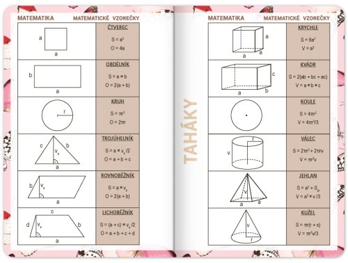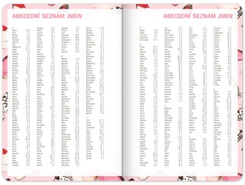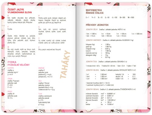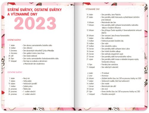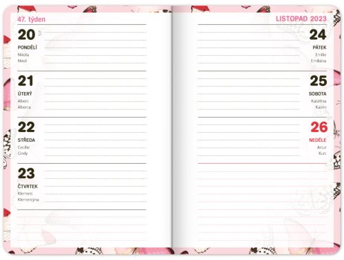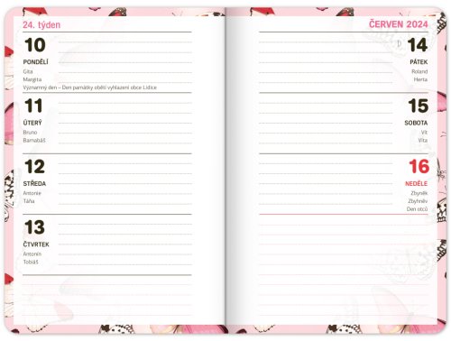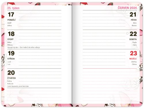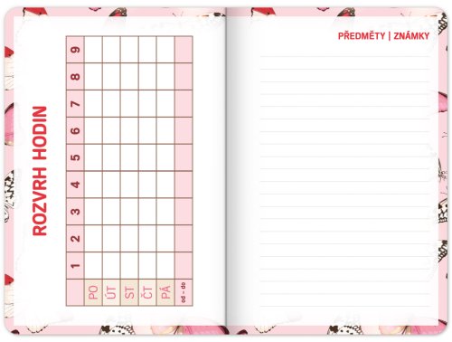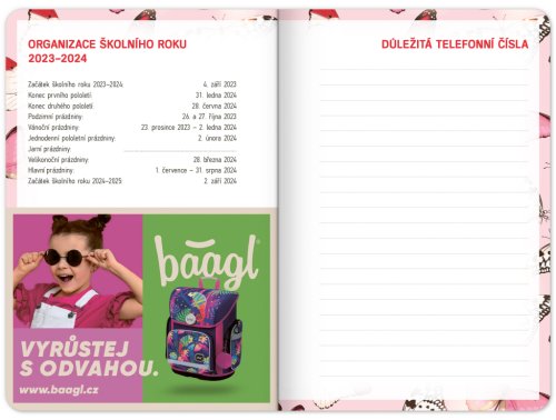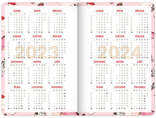 Školní diář s abstraktním motivem v růžové barvě obsahuje přehled na rok 2023 a 2024, české týdenní řádkové kalendárium se jmény a svátky, rozvrh hodin, prostor na poznámky. Kalendárium začíná v září 2023 a končí v prosinci 2024.