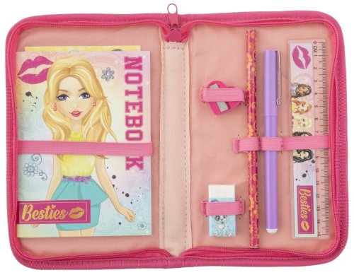 Školní penál s vybavení Besties – obsahuje pravítko, ořezávátko, pero, tužku, gumu + notýsek Besties.
