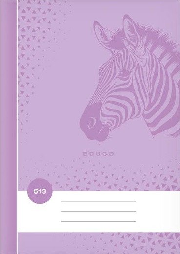 Školní linkovaný sešit ve formátu A5, ve fialové barvě, s motivem zebry, v deskách z křídového papíru. <br> <br> Typ: 513 <br> Formát: A5 <br> Motiv: zebra <br> Barva: fialová <br> Šířka řádku: 12 mm <br> Počet listů: 10, linkované <br> Gramáž listů papíru: 60 g <br> Desky: matný křídový papír 200 g