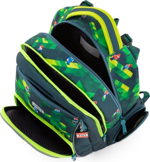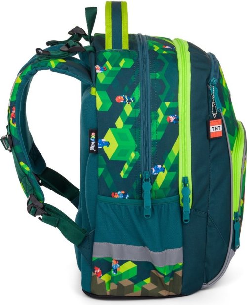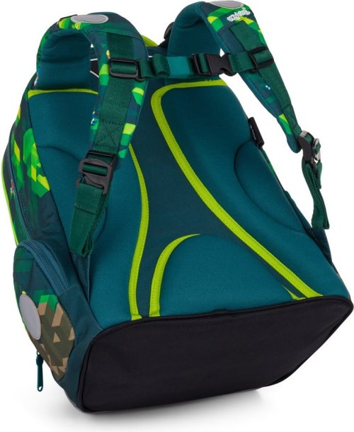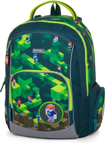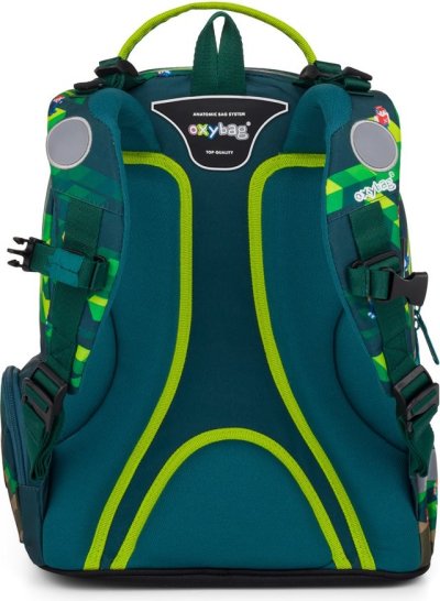 Školní batoh OXY GO zaujme moderním designem a promyšlenou funkčností. Má anatomicky tvarovaná, prodyšná záda a nastavitelné ramenní popruhy pro pohodlné nošení. Přidané háčky umožňují uchycení dlouhých popruhů. Vnitřní kapsy nabízí dostatek místa na učebnice, sešity i další potřeby, pevné nepromokavé dno chrání obsah před ušpiněním a protečením. Boční kapsy, jedna na zip a jedna otevřená, slouží např. na láhev. Reflexní prvky zajišťují bezpečnost. Batoh je ideální pro děti od 1. do 3. třídy vysoké od 125 cm. Délka zádového panelu je 39 cm, objem 22 l, hmotnost 930 g, nosnost 8 kg. Sáček: Praktický na cvičky nebo volnočasové aktivity, uzavírá se šňůrkami. Penál: Jednopatrový se dvěma chlopněmi, poutka na psací potřeby a průhledná fólie na rozvrh hodin.