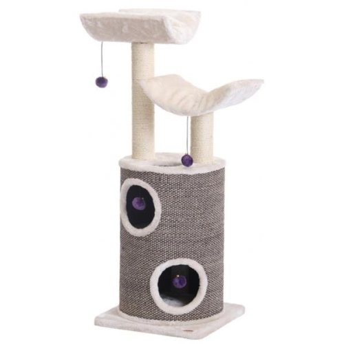 Pohodlný strom na škrábání s pelíškem a polstrovanou vyhlídkou. Kočky musí mít možnost k broušení svých drápků. Ve volné přírodě jim k tomu nejlépe slouží stromy a jejich kůra. V bytě jim pak musíte vy nabídnout tu pravou a vhodnou alternativu. Jinak si malý nezbeda najde náhradu například ve vašem nábytku, křesle nebo koberci. Plošiny na ležení jsou kompletně potaženy plyšem, horní vyhlídka je polstrovaná, škrabadlo je vyvedeno v elegantní béžové barvě a obsahuje plyšové fialové kuličky s rolničkami na hraní. Parametry: