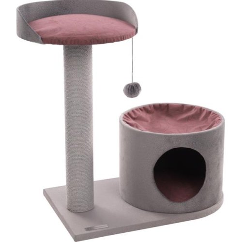 Škrabadlo střední velikosti v šedé barvě s pelíškem na odpočívání. Škrabadlo obsahuje pelíšek, který je polstrovaný a domeček. Domek i pelech je polstrovaný a ze spodní strany potažený látkou. Obsahuje kuličku, která je zavěšená na škrabadla pro aktivnější zábavu vaší kočky. Rozměry: 65 × 35,5 × 65 cm Použití: Sestrojte dle návodu a umístěte na vhodném místě ve Vašem bytě. Kočky musí mít možnost k broušení svých drápků. Ve volné přírodě jim k tomu nejlépe slouží stromy a jejich kůra. V bytě jim pak musíte Vy nabídnout tu pravou a vhodnou alternativu. Jinak si malý nezbeda najde náhradu například ve Vašem nábytku, křesle nebo koberci.