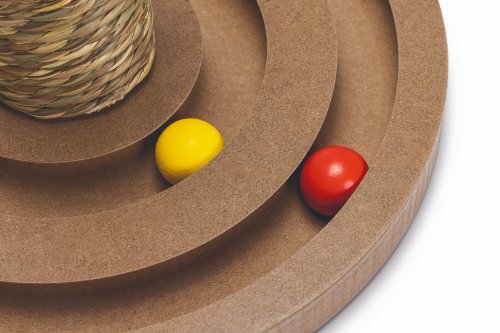 Škrabadlo Brigitte je skvělý kus škrabacího nábytku pro hravé kočky. Do dřevěné základní desky jsou zakomponovány dvě kuličkové dráhy, ve kterých se kočka může pohybovat a pronásledovat dvě barevné dřevěné kuličky.