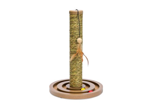 Další dřevěná koule je připevněna na laně v horní části sloupu jako pohyblivá hračka. Tento herní prvek je navíc vybaven peřím, aby upoutal zájem kočky.