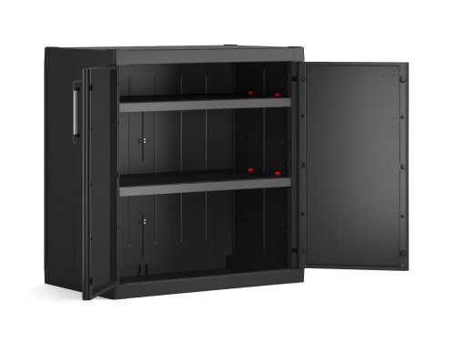 Skříň obsahuje celkem 2 přídavné police - každá s výraznou nosností až 25 kg, které přijdou vhod pro výrazně těžší předměty všeho druhu. Lze ji tedy využít pro skladování dílenského nářadí či zahradnických potřeb, kdy přijde vhod pro uložení náčiní, které by se jinam nevešlo. Díky svému provedení v neutrální černé barvě zapadne do každého prostoru bez ohledu na jeho konceptuální styl.