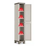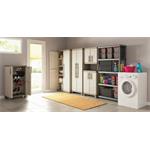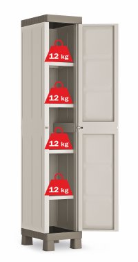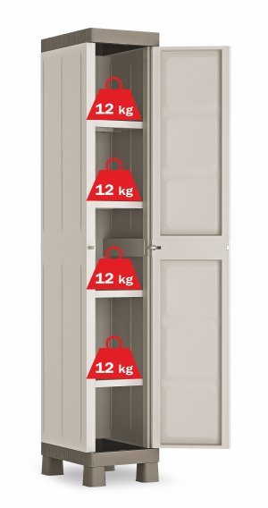 Skříň obsahuje celkem 4 přídavné police - každá s výraznou nosností až 12 kg, které přijdou vhod pro výrazně těžší předměty všeho druhu. Lze ji tedy využít pro skladování dílenského nářadí či zahradnických potřeb, kdy přijde vhod pro uložení náčiní s dlouhou násadou, které by se jinam nevešlo. Díky svému provedení v univerzální béžové barvě zapadne do každého prostoru bez ohledu na jeho konceptuální styl.