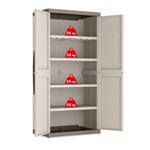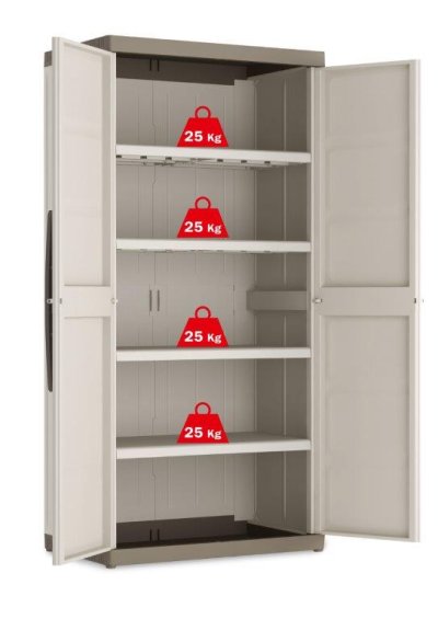 Skříň obsahuje celkem 4 přídavné police – každá s výraznou nosností až 25 kg, které přijdou vhod pro výrazně těžší předměty všeho druhu. Lze ji tedy využít pro skladování dílenského nářadí či zahradnických potřeb, kdy přijde vhod pro uložení náčiní s dlouhou násadou, které by se jinam nevešlo. Díky svému provedení v univerzální béžové barvě zapadne do každého prostoru bez ohledu na jeho konceptuální styl.