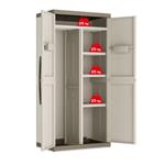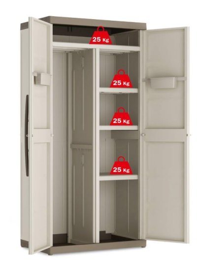 Skříň obsahuje celkem 3 přídavné police - každá s výraznou nosností až 25 kg, které přijdou vhod pro výrazně těžší předměty všeho druhu. Lze ji tedy využít pro skladování dílenského nářadí či zahradnických potřeb, kdy přijde vhod pro uložení náčiní s dlouhou násadou, které by se jinam nevešlo. Díky svému provedení v univerzální béžové barvě zapadne do každého prostoru bez ohledu na jeho konceptuální styl.