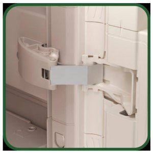 V případě potřeby skříň uzamknete pomocí visacího zámku (není součástí balení). Tato skříň navíc odolá vodě a díky zpevněnému dnu a tyčce, která vyztužuje každou polici, je konstrukce stabilní a bezpečná i při větším zatížení.