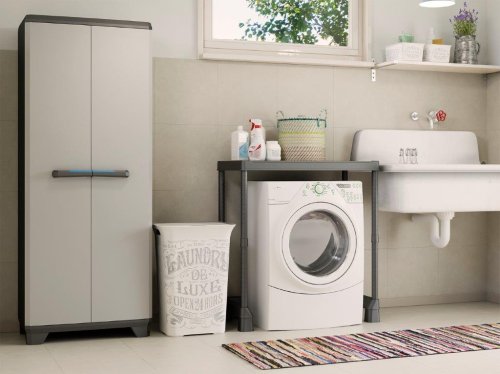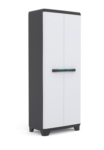 Skříň je vyrobena z kvalitního plastu, který je pevný, lehký a odolný. Díky třem výškově nastavitelným policím si interiér snadno přizpůsobíte podle velikosti ukládaných předmětů. Modré ergonomické úchyty umístěné na středu dveří zajišťují pohodlné otevírání i při plném zatížení.
