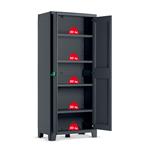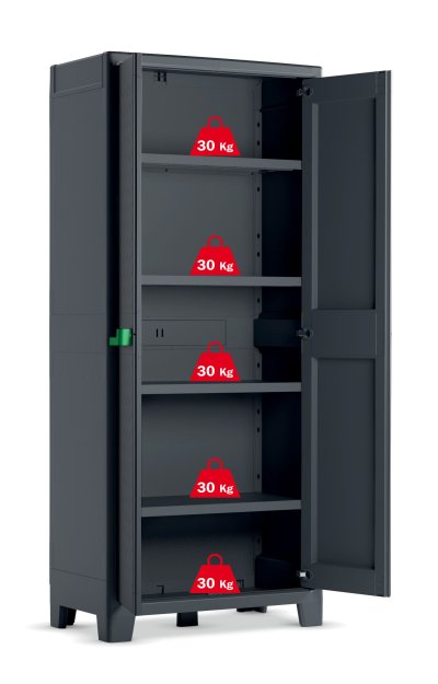 Skříň obsahuje celkem 4 přídavné police - každá s nosností až 30 kg, které přijdou vhod pro výrazně těžší předměty všeho druhu. Lze ji tedy využít pro skladování dílenského nářadí či zahradnických potřeb, kdy přijde vhod pro uložení náčiní s dlouhou násadou, které by se jinam nevešlo.