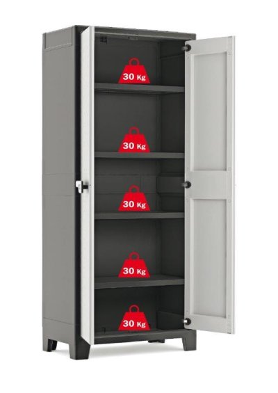 Skříň obsahuje celkem 4 přídavné police – každá s výraznou nosností až 30 kg. Hodí se tedy pro skladování i výrazně těžších předmětů. Můžete využít také její zesílené dno, které unese stejnou váhu jako police. Uskladněte do ní dílenské nářadí, zahradnické potřeby, pomůcky a prostředky pro úklid či praní nebo na poličky vyskládejte zavařeniny (marmelády, kompoty, pyré). Výšku poliček si navíc zvolíte podle velikosti uložených předmětů.