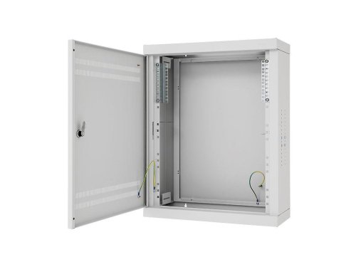 V horní polovině skříně najdete posuvné držáky, které osadíte 19” patch panely nebo jističovou vanou (svislá montáž). Na bocích v dolní polovině jsou držáky pro 19” zařízení, ty využijete při vodorovné montáži. Kabelové vstupy s vylamovacími záslepkami jsou umístěné na stropě a dně skříně. Na spodní části se nachází šroub M8 pro připojení pospojení.