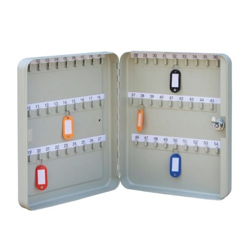 Kompaktní plochá schránka bez velkých nároků na prostor Vyrobena z ocelového plechu lakovaného práškovou barvou Lišta s háčky pro zavěšení klíčů s raženými čísly Součástí dodávky je i stejný počet visaček …