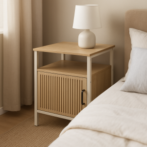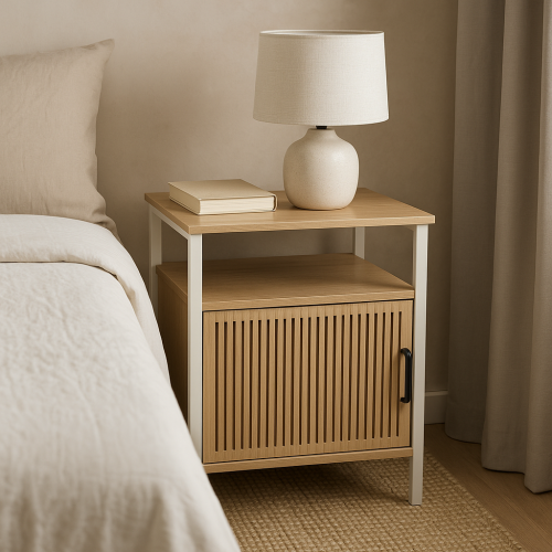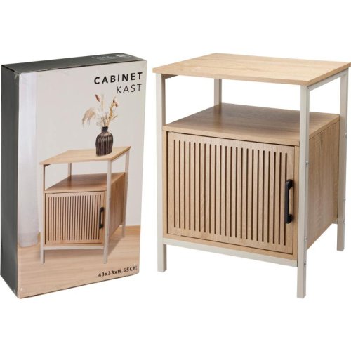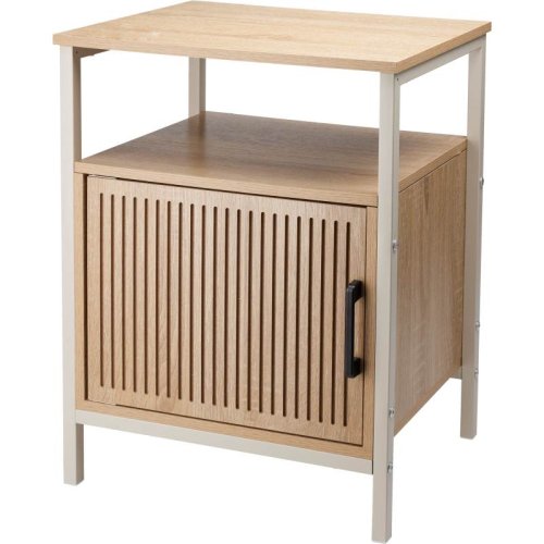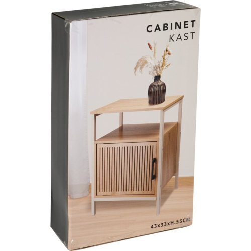 Praktická skříňka s krémově bílým kovovým rámem, vybavená bílými MDF policemi a dveřmi z přírodní MDF dýhy, vhodná pro stylové uložení drobných předmětů.